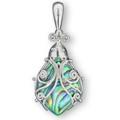 An 18x5mm Paua shell pear is the colorful background for a sterling silver overlaid lady bug. This pendant is a whimsical design and the total length is 1 3/4" . Designed by Marianna and Richard and handmade by the Artisans of Bali!