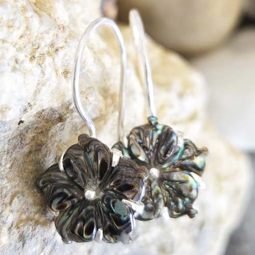Pretty flowers with Sterling Silver centers make these earrings just perfect! The flowers are 10mm Abalone Shell. These earrings have a latching back and measure 1" from the ear!
