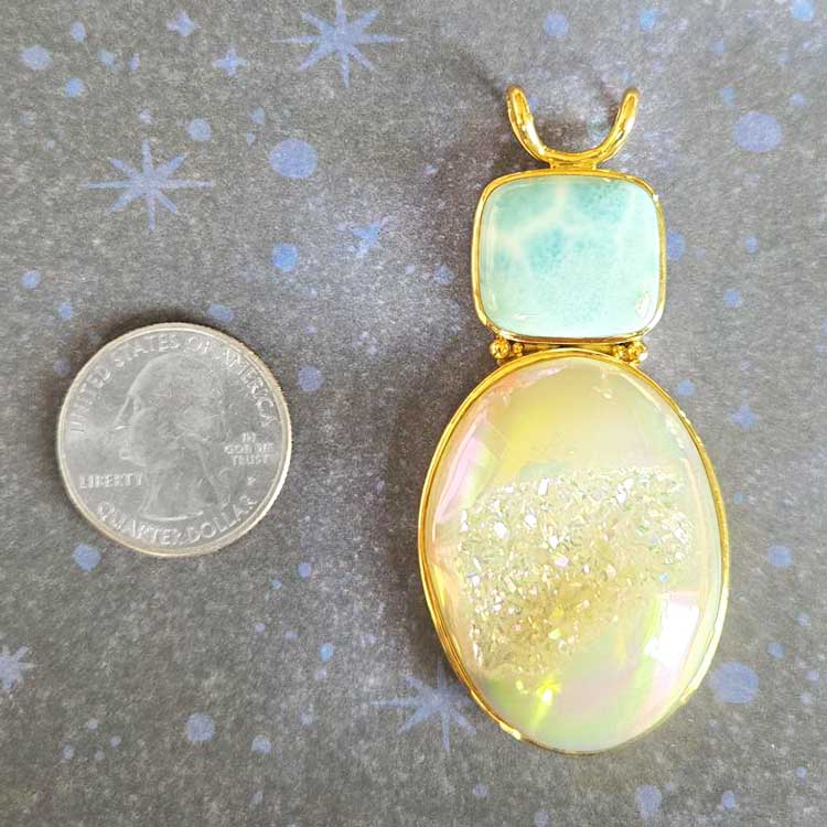 18K GOLD Larimar and Opalized Window Druzy Pendantsw409_quartersw409_sidesw409_back_ruler