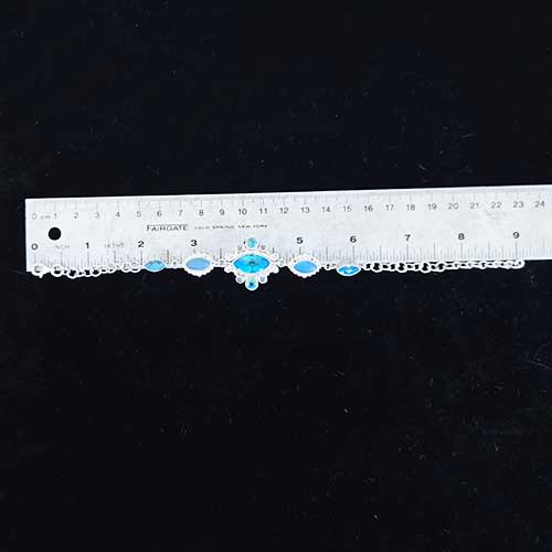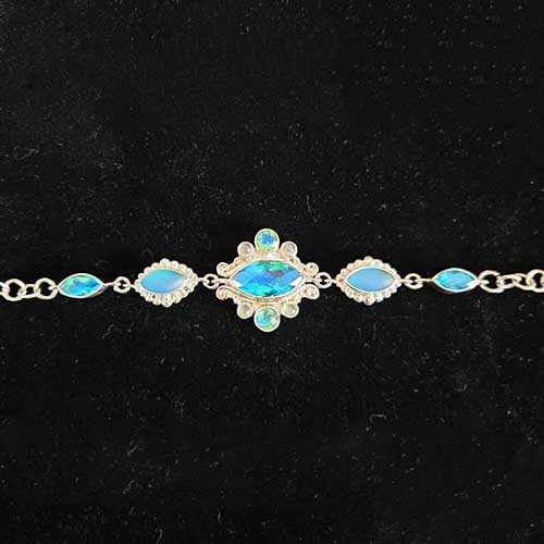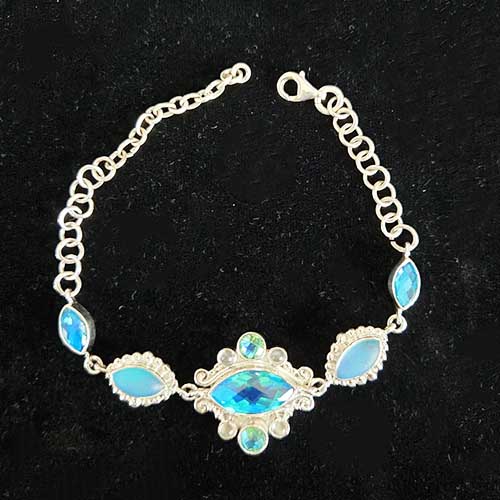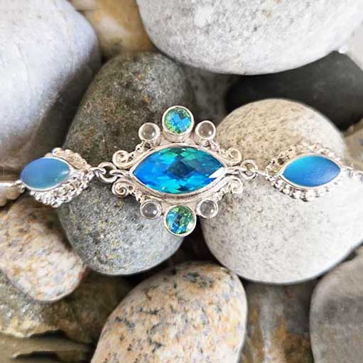 A sparkling blue hued beauty that is reminiscent of the Caribbean Sea, this bracelet contains Caribbean Quartz in all of its glory! Both Faceted and frosted Caribbean Quartz adorn this piece as well as four Moonstone rounds. Designed by Marianna and Richard and handmade by the Artisans of India, this is a one of a kind sample that you absolutely won’t want to miss! It can be worn from 6-9" depending upon where you attach the lobster clasp!