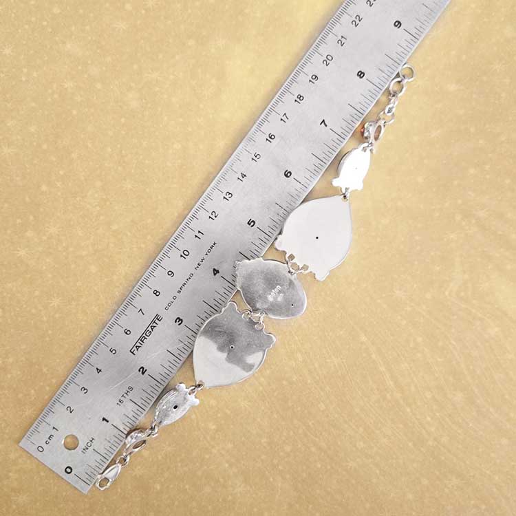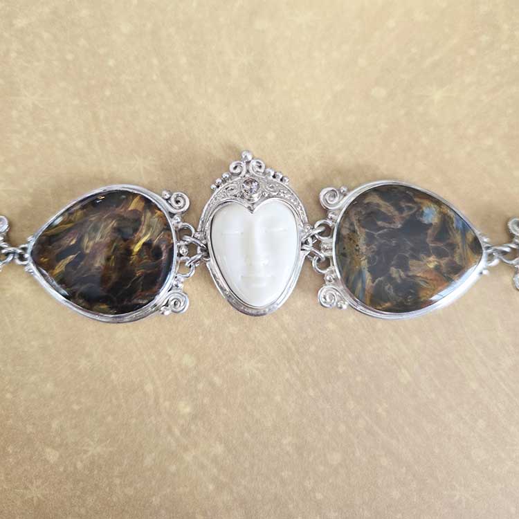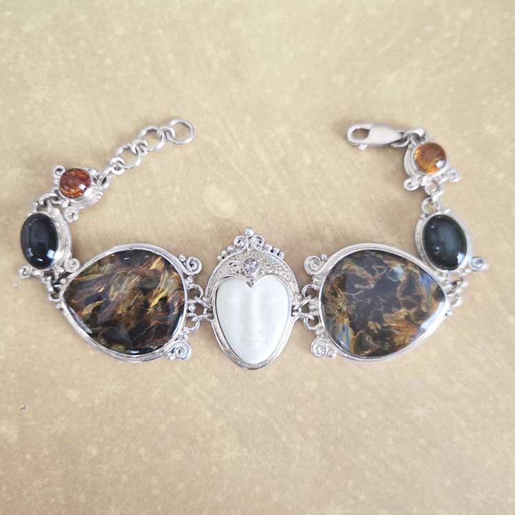A gorgeous and stately goddess link bracelet by designers Marianna and Richard! This piece was handmade by Balinese Artisans and features rare, genuine gemstones of the upmost quality! Our goddess wears a serene expression while also wearing a stunning sterling silver bead adorned headdress! A single 4x5mm oval of Tanzanite is also featured! The large Pietersite is colorful and appears to contain its own inner light! They are truly amazing stones! They measure 27x30mm. Rainbow Obsidian ovals are next (10x15mm) followed by Amber rounds (8mm). This bracelet measures 7 ½” long with 1” of extension. A lobster clasp keeps it secure on your wrist!