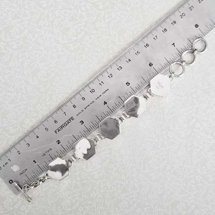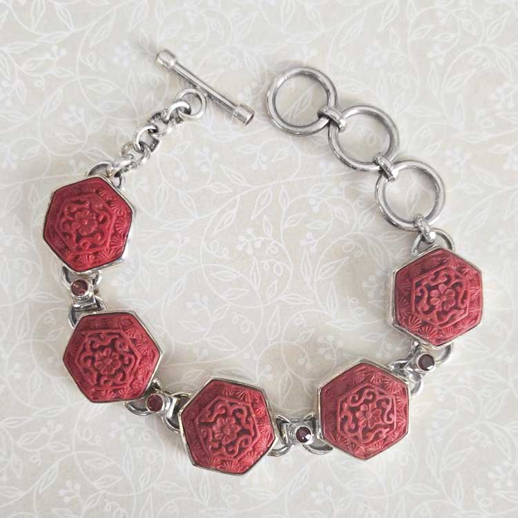 This hand-crafted Sterling Silver link bracelet has five 18mm beautifully engraved red Cinnabar floral hexagons, alternated with 3mm faceted round Garnets. Two more 3mm faceted Garnets decorate the ends of the toggle clasps. The back is fully backed in sterling silver. This bracelet can be worn between 6 1/2" and 8" long.