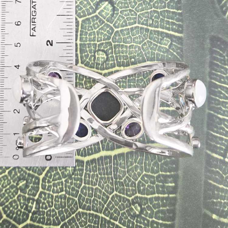 A stunning display of color and texture, this amazing cuff bracelet by designers Marianna and Richard is sure to get noticed! The center is marked by a cushion of Paua Shell (15x15mm), this is flanked by Lapis (8x10mm), Amethyst (8x10mm), Peridot (5mm), Sky Blue Topaz (5mm), Swiss Blue Topaz (5x7mm) and Rainbow Moonstone (10mm).  So many gorgeous gemstones and a fun open silver work design! This fabulous cuff measures 1 1/2" wide and 6" long with a 1" gap. This bracelet is a one of a kind sample straight from the designer’s, Marianna and Richard, private samples!