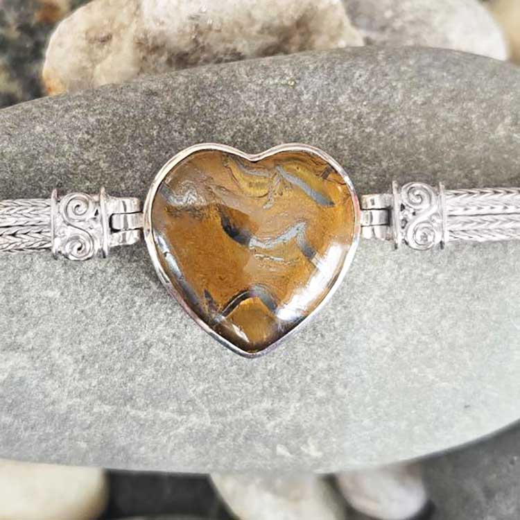 A 25mm cabochon Tiger Iron carved heart is set into sterling silver and is the focal point for this sterling silver bracelet. The band is serpentine sterling silver. The clasp is eye and toggle. Total length is between 8 - 9".
