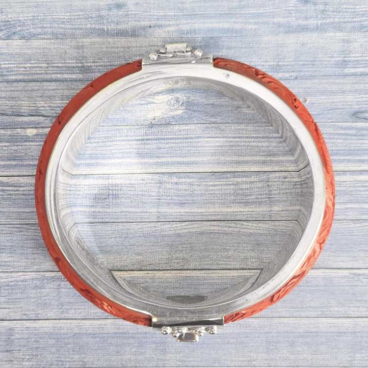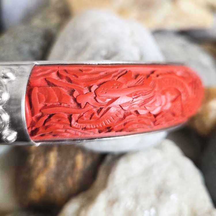 This is a beautiful wide red Cinnabar bangle hand carved with an intricate dragon motif! This Cinnabar is set on a polished sterling silver bangle. Two Sterling Silver stations feature handmade and hand placed silver wire swirls and beads as well as a 7x7mm square of Garnet! Red is associated with the root chakra. It represents desire and love, strength and transformation! The inside diameter 2 1/2" x 2 ¾ (oval) and it is not adjustable. The width of the band is ¾”. Designed by Marianna and Richard and handmade by Balinese Artisans. This bangle is a “last-of”!