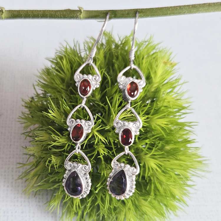 These Garnet and Iolite earrings hit the mark with their perfect balance of simplicity and elegance. These earrings have great movement and length. A 4x6mm Cabochon Garnet, a 4x6mm faceted Garnet and a 6x9mm faceted Iolite pear make these earrings a perfect match for so many Sajen items. They have an overall length of 2.5"