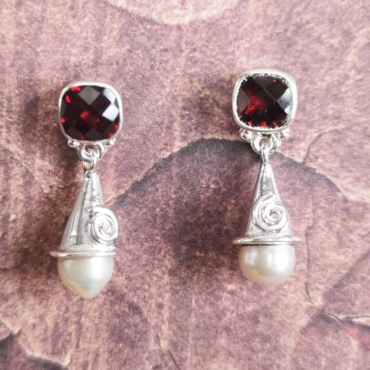 Cushion shaped and checkerboard cut these 8mm Garnets sparkle beautifully with their deep red color! A great pairing for the luminescent Peach pearls that dangle below! These earrings were designed by Marianna and Richard and handmade by the Artisans of Bali, the total length of these posts is 1 1/8" long.