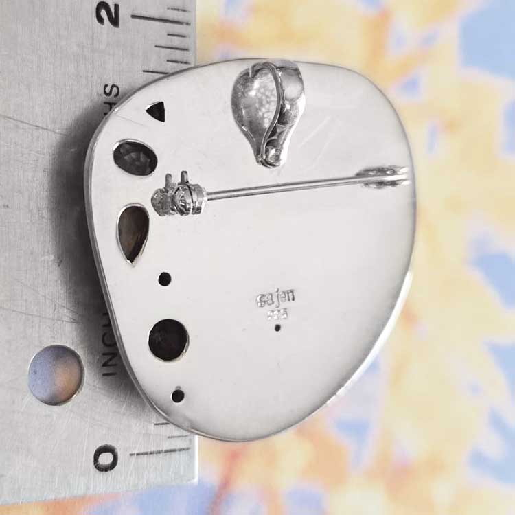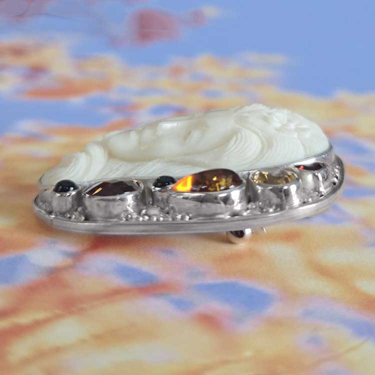 Celebrate the Goddess within with this natural beauty with her flowers in her long flowing hair. A hand carved piece of art made by Balinese Artisans and designed by Marianna and Richard. The pin pendant features six accent stones from top to bottom; 4mm faceted Garnet trillion, a 5x7mm faceted Citrine oval, a 6x9mm cabochon Amber pear, two 3mm Black Star Diopside and a 7mm faceted checkerboard Garnet. Amidst the sparkling stones you will find hand placed and hand made Sterling Silver beads. The bone Goddess carving measures 30x40mm. The total length of this masterpiece is 1 3/4". To have the soft as well as sparkling earthtones, this Goddess can be worn both as a Pin or worn as a pendant with a bale that will fit up to 4.5mm beads or chain.