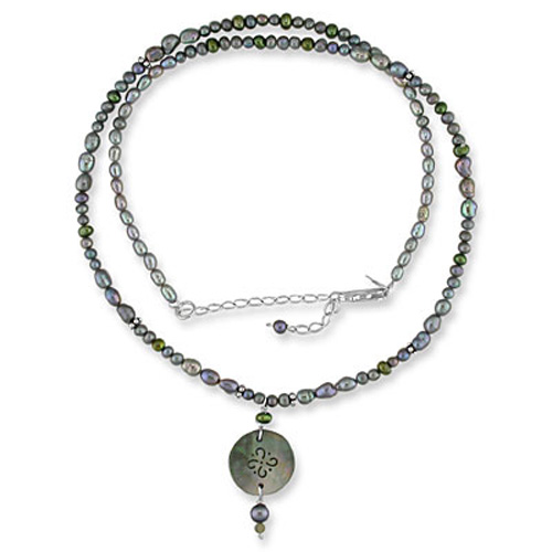 A standalone knockout, this necklace is so charming. Grey and Green Freshwater Pearls are enhanced with Sterling Silver Bali beads. A 15mm disk of Black Mother of Pearl hangs at the center of this necklace and is hand-carved at its center with a pretty design. The necklace measures 18" in length, has a 2" sterling silver extender, and lobster claw clasp.