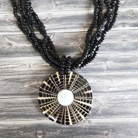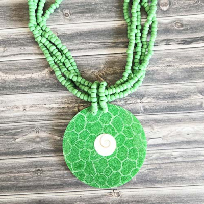 Fun, Glamorous and affordable, this snazzy necklace is a great addition to your jewelry box!  The 18-19" Necklace features five strands of green beads with a bead toggle.  The Centerpiece is 2-1/2" Round Pendant which is created out of sliced coral and reinforced with resin.  The "Shiva Eye" is the round  shell set in the center,  a beautiful shell that naturally falls off the living shell at the end of its life.  It is then ground smooth in the ocean's currents before washing to shore to be collected.  The spiral of life, the Koru, the Reiki symbol, all the share the spiral symbol found in nature.