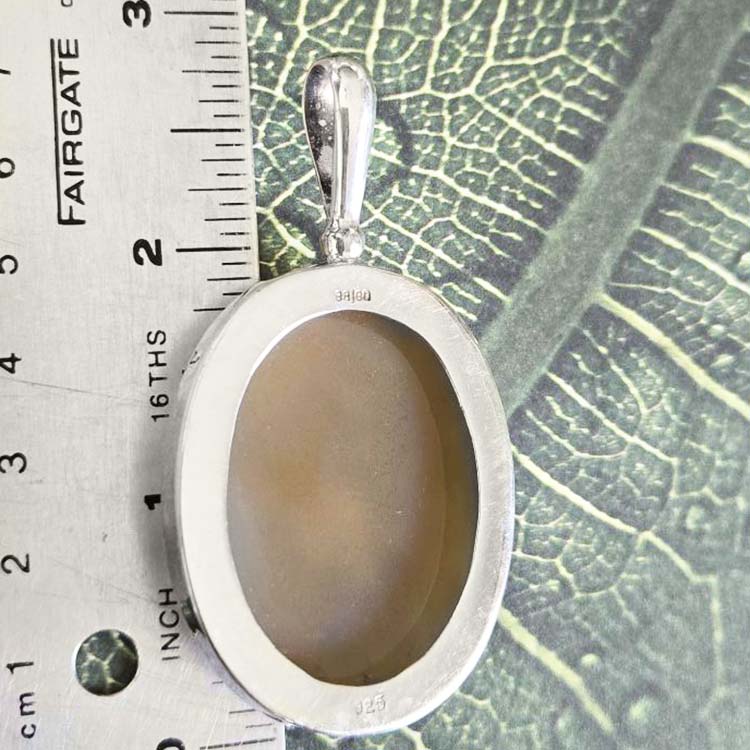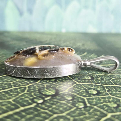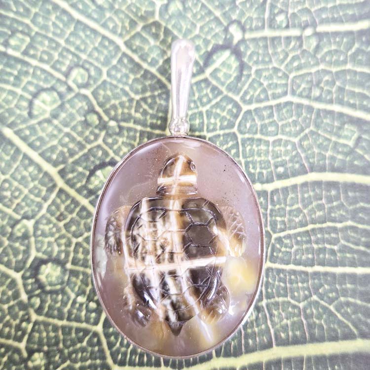 This pendant is so unique and interesting! A relief of a turtle has been hand carved into a35x45mm oval of Agate. The carvers find the darker sections of Agate to maximize the dimensional look of the turtle! This aquatic animal is associated with the earth and many creation stories! The turtle also symbolizes peace and longevity! Designed by Marianna and Richard and handmade by Balinese Artisans! This pendant is 2 1/2" long and 1 1/2" long!