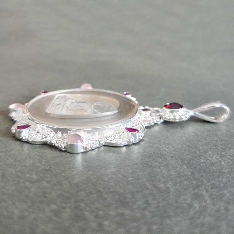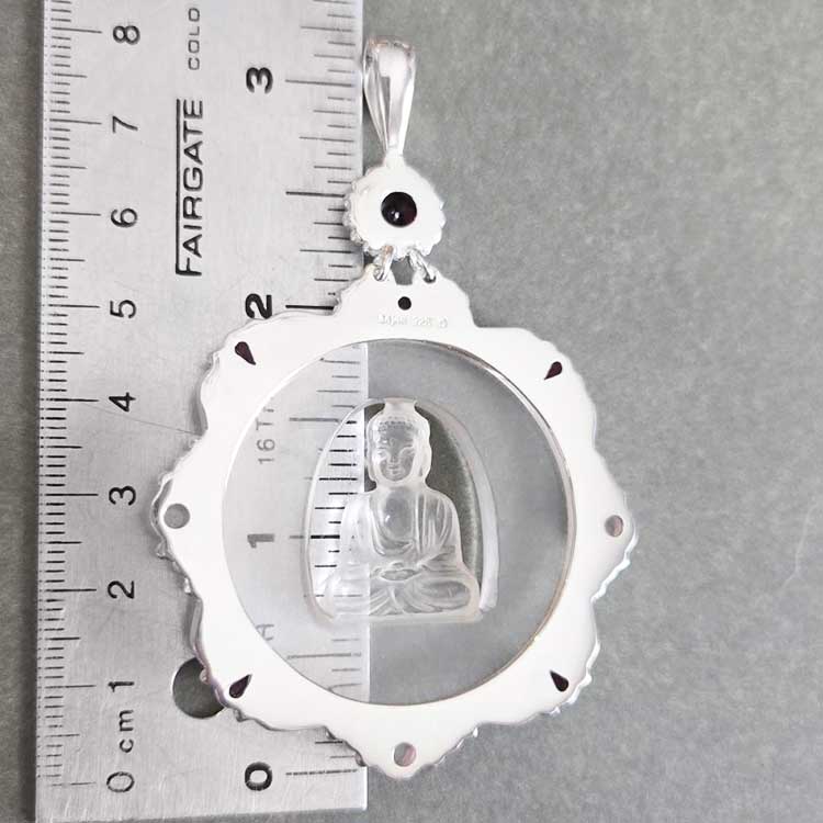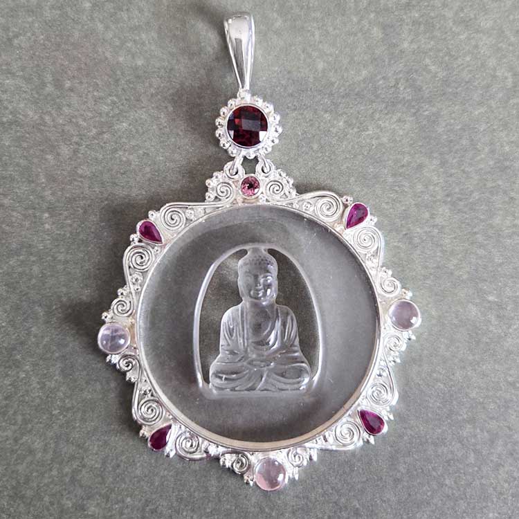A serene hand carved crystal Buddha is the emphasis of this beautiful piece. The buddha is framed in by sterling accented with a 4mm faceted pink tourmaline, four 3x5 faceted pear shaped rubies, and three 5mm rose quartz. The bottom of its bail features an impressive 7mm round faceted checkerboard garnet. Total length of this piece is 3 inches.