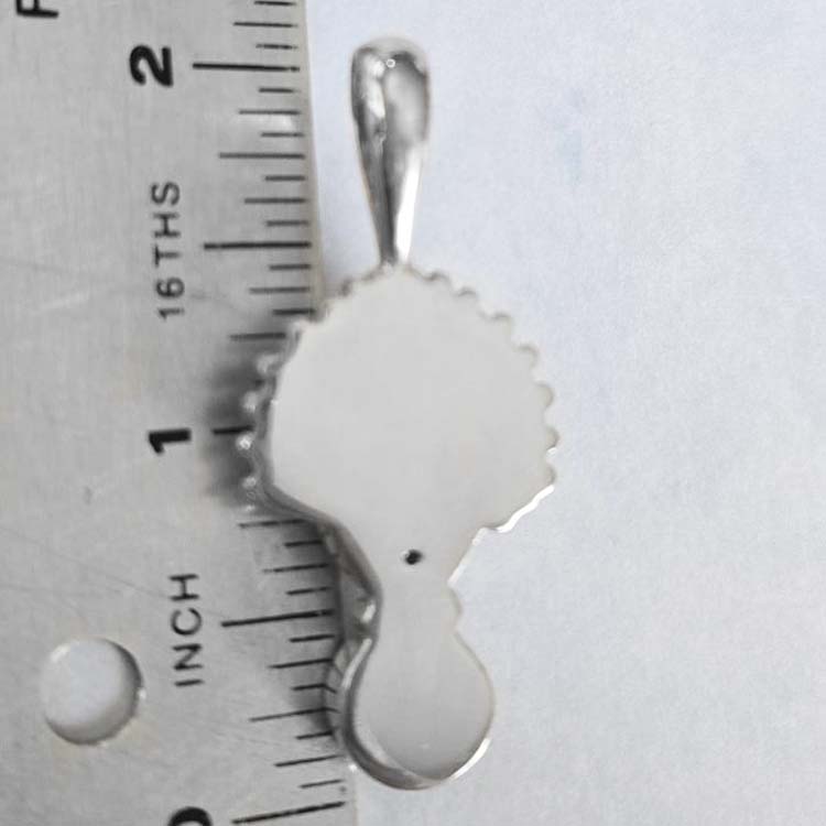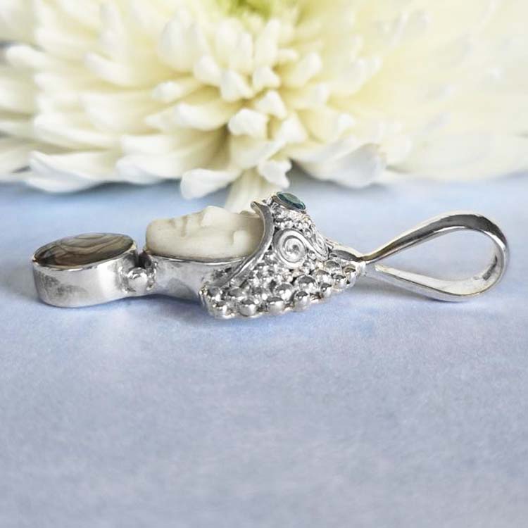 A charming goddess wears a crown of handmade and hand placed beads and a faceted round of Blue Topaz (4mm). A stunningly colorful swirled Paua Shell (10mm) completes the look! This piece was designed by Marianna and Richard and handmade by Balinese Artisans. It measures 2" long and nearly 1" wide.