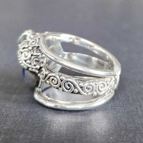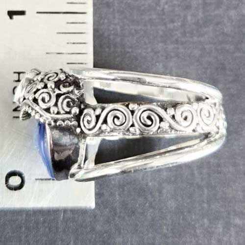Glowing Blue Fiber Optic is an eye catching choice for a goddess ring! This12x14mm Goddess has a luminous quality, making it look like it possesses its own inner light! The aqua blue 4x6mm faceted Apatite pear in her headdress is a perfect compliment! This ring is open in the back for slight adjustment (up to one size) and added comfort. Designed by Marianna and Richard and handcrafted by the Artisans of Bali. The total length is 5/8".