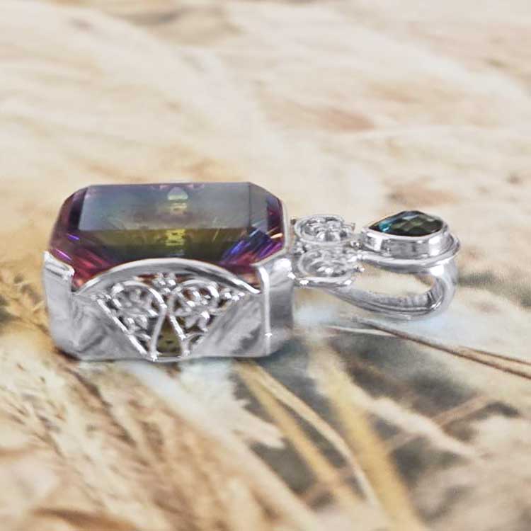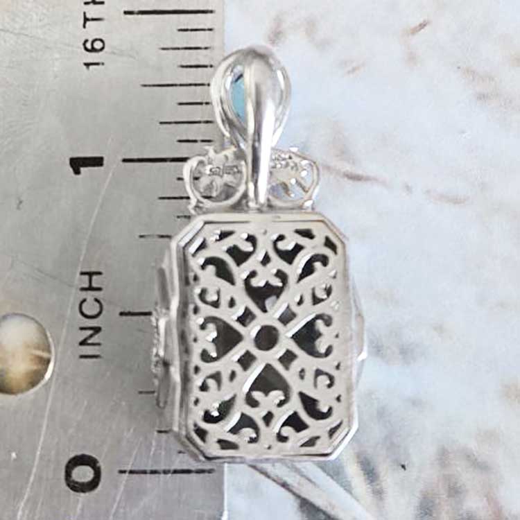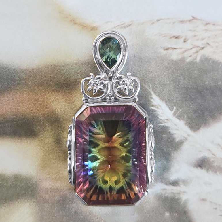 One of a Kind Sample straight from the designer’s private creations with their team in India! This stylish pendant features a bright Starlight Quartz. It flashes all of the colors of the rainbow! The accent stone on the bale is a Teal colored quartz pear! The entire back of the piece is comprised of intricate silver work reminiscent of the tapestries found in India. This pendant measures1 ¼” long. Designed by Marianna and Richard and crafted by the Artisans of India!