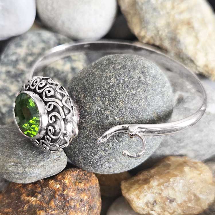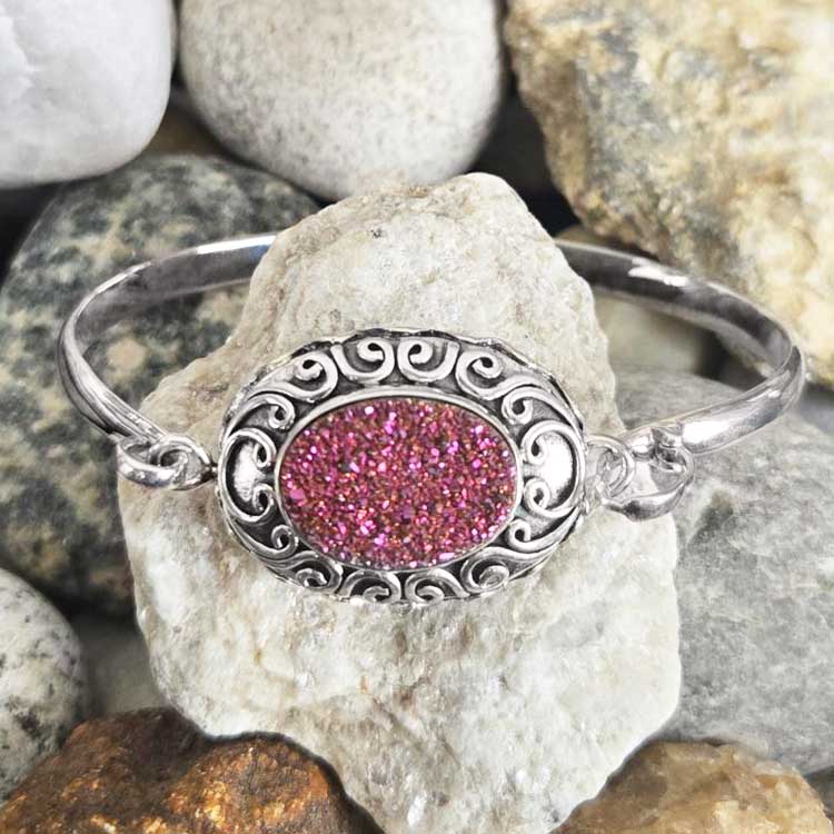 A fun design, this bracelet is completely reversible! On one side we find a large Celestial Lemon Lime Quartz (14x18mm) and on the other a Sunset Druzy (14x18mm). Around the stone is decorated with Sterling Silver details and the clasp keeps it secure it on the wrist. A swiveling jump ring allows the middle piece to rotate. The wearable length is approximately 7”.  Made in India this is a one of a kind sample straight from the designer’s (Marianna and Richard) private collection.