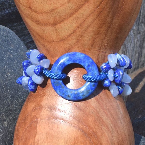 Double knotted by hand, this 4 strand Beaded Bracelet is a must have! Amazing price for genuine Lapis and Blue Chalcedony. A genuine 30mm Lapis circle marks the center of this comfortable polished smooth bracelet. It fits up to a 7-1/2" wrist. Feel the soothing calm of all that blue!