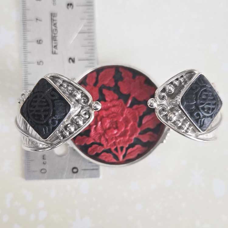 Cinnabar is resin collected from the Laq tree. This resin is hardened in layers and carved into the intricate designs that you see here. Typically a bright red color, this cuff bracelet features both black and red providing a unique and bold look! The focal point of this solid Sterling Silver cuff is a 45mm black and red carved Cinnabar rose! On each side we find a 5mm faceted rounds of Garnet. The Sterling Silver is fashioned into a leaf pattern and the cuff ends with 15mm black carved cinnabar squares. This bracelet was designed by Marianna and Richard and handcrafted by the Artisans of Bali! It measures 6 ½” long with a ½” gap.