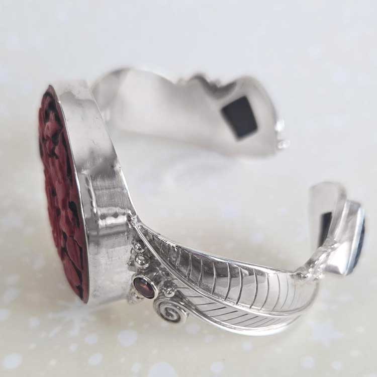 Red and Black Cinnabar Cuff Bracelet with Garnet PV517