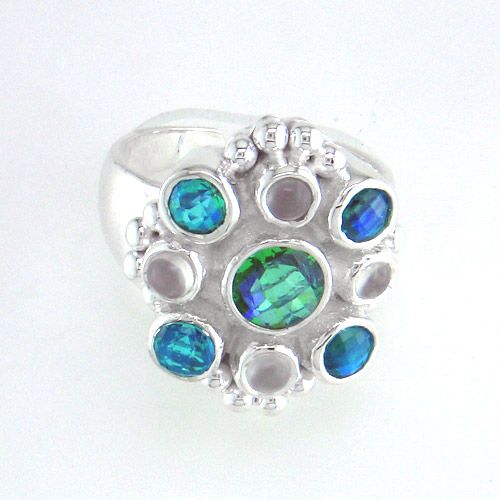 An eye catching symmetrical design and sparkle to spare, this ring is gorgeous! Featuring a large checkerboard cut Caribbean Quartz in the center flanked by four Rainbow Teal Quartz and four Moonstones, this designer ring is sure to get noticed. Designed by Marianna and Richard and handmade by the Artisans of India, we know this ring will soon become a favorite. The face measures 13/16" x 5/8" and the band has been left open in the back to allow you to adjust up to one ring size larger.
