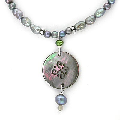 A standalone knockout, this necklace is so charming. Grey and Green Freshwater Pearls are enhanced with Sterling Silver Bali beads. A 15mm disk of Black Mother of Pearl hangs at the center of this necklace and is hand-carved at its center with a pretty design. The necklace measures 18" in length, has a 2" sterling silver extender, and lobster claw clasp.