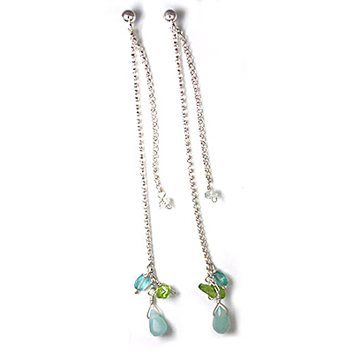 These elongated drop earrings with a chain design and genuine gemstones that dangle below, measure a whopping 3.5" long! These earrings have two chains, one longer than the other. The shorter chain features an Aquamarine chip while the longer is comprised of Amazonite drops, Peridot and Apatite chips. These chains hang from Sterling Silver posts. Designed by Marianna and Richard and handmade by Balinese Artisans.