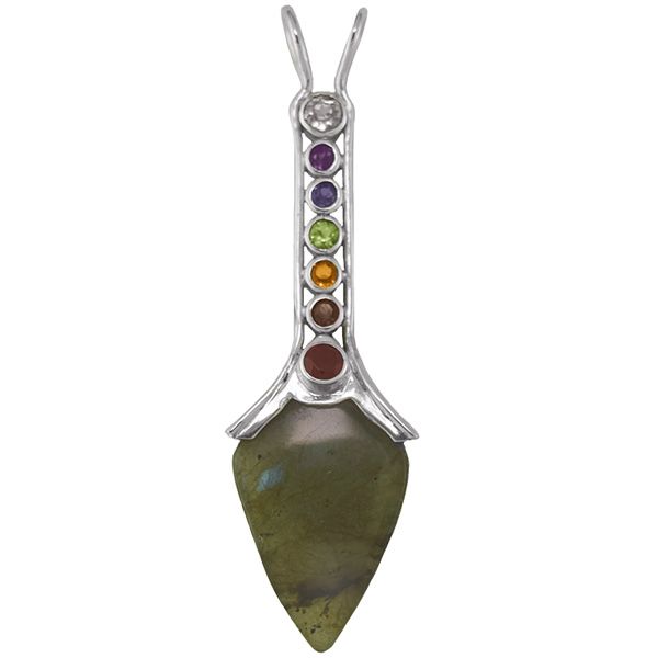 Designed by Marianna and Richard Jacobs of Sajen, This Sterling Silver Handmade pendant features an 18x25mm polished open point (10mm thick) of Labradorite. It can be used as a Pendulum, or enjoyed for the changing colors of the magical Labradorite enhanced by the multiple colors above. Polished smooth, The Labradorite is thought to be the stone of transformation and when worn thought to help clear the 6th Chakra, allowing clarity of thought and action. The Labradorite is thought to be especially helpful to organize ones thoughts and life and enhance productivity. Bezel set above you have 7 genuine 3-4mm Faceted Gemstones that correspond to the Chakras of the body; Garnet, Smoky Quartz, Citrine, Green Peridot, Iolite, Amethyst and White Topaz. The Double bale allows for perfect balance on up to 4mm beaded Necklaces or Silver Chains. The total length of the pendant is 2-3/4''. We invite you to bring some balance to your life.