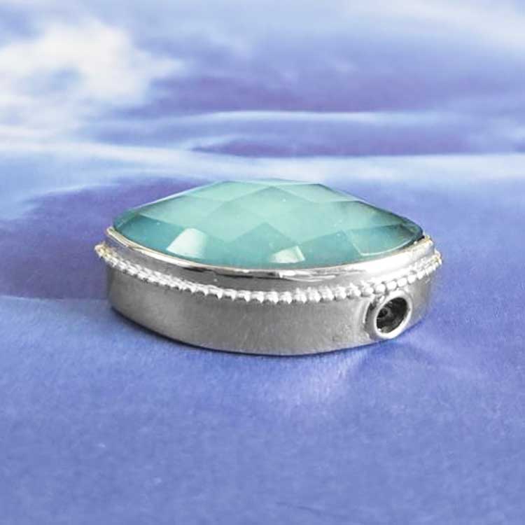 One of a Kind Sample straight from the designer’s private creations with their team in India! This shimmering beauty features a single 12x24mm marquis of Mother of Pearl Backed Aqua Colored Quartz! The entire back of the piece is comprised of intricate silver work reminiscent of the tapestries found in India and the cut through bale is a fun and unique design element! This piece was designed by Marianna and Richard and handmade by the Artisans of India. It measures 1” long and ½” wide.