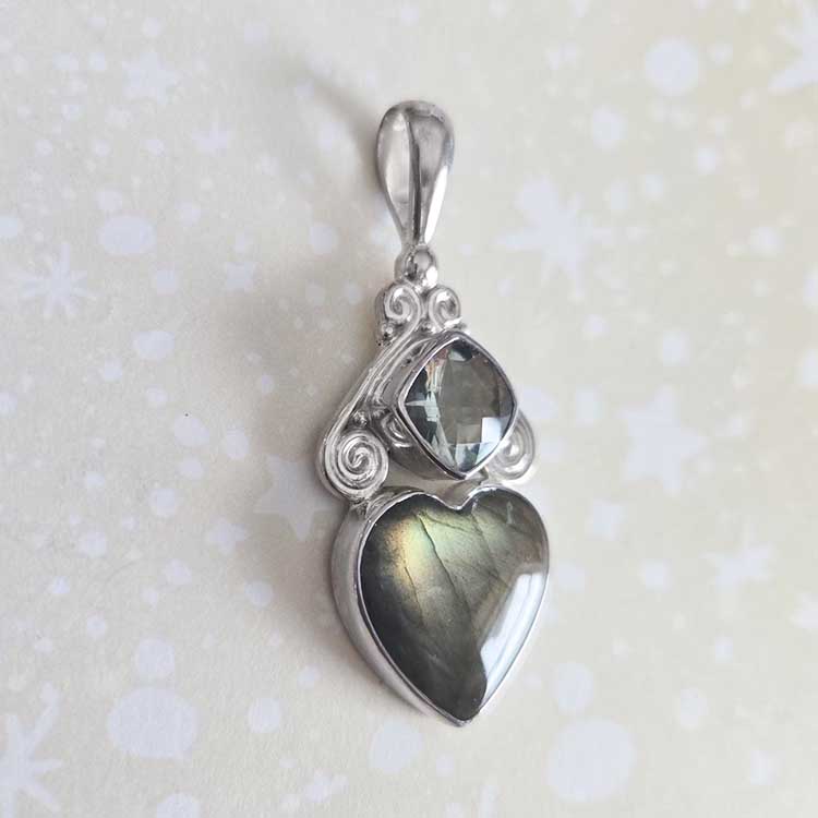 Sterling Silver Labradorite Heart and Light Green Quartz Silver Pendant