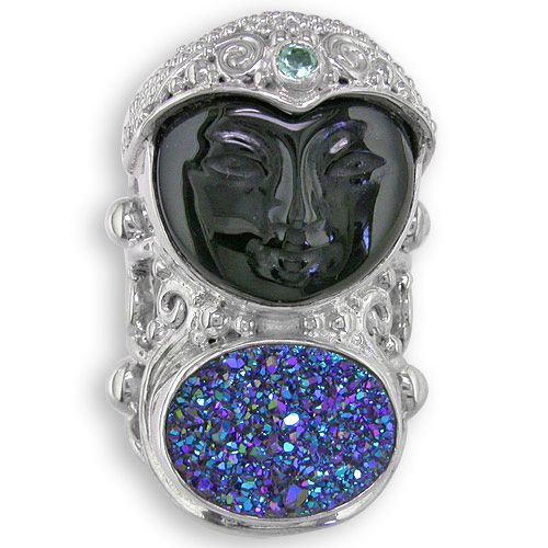 Bring some sparkle into your life with this Rainbow Obsidian Goddess Ring! Sterling silver and handmade by the Artisans of Bali, this ring is simply stunning to behold! The Goddess is hand-carved out of an 18mm Round Rainbow Obsidian and is adorned with a 3mm Apatite on her her headdress and below is a 12x16mm Caribbean Druzy in all its sparkling glory! Every silver bead had been created and set by hand along with the wire work that give her some added dimension. Extremely comfortable, the silver work is designed so the goddess conforms to the shape of your finger, just under 1-1/2" in length and approximately 3/4" in width. The ring shank has been left open in the back so although yours will come sized you can adjust it up to a size larger.